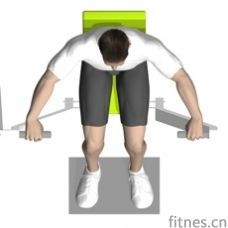 坐在推胸机器上,调整座位让手柄平胸部。使前臂与躯干垂直。